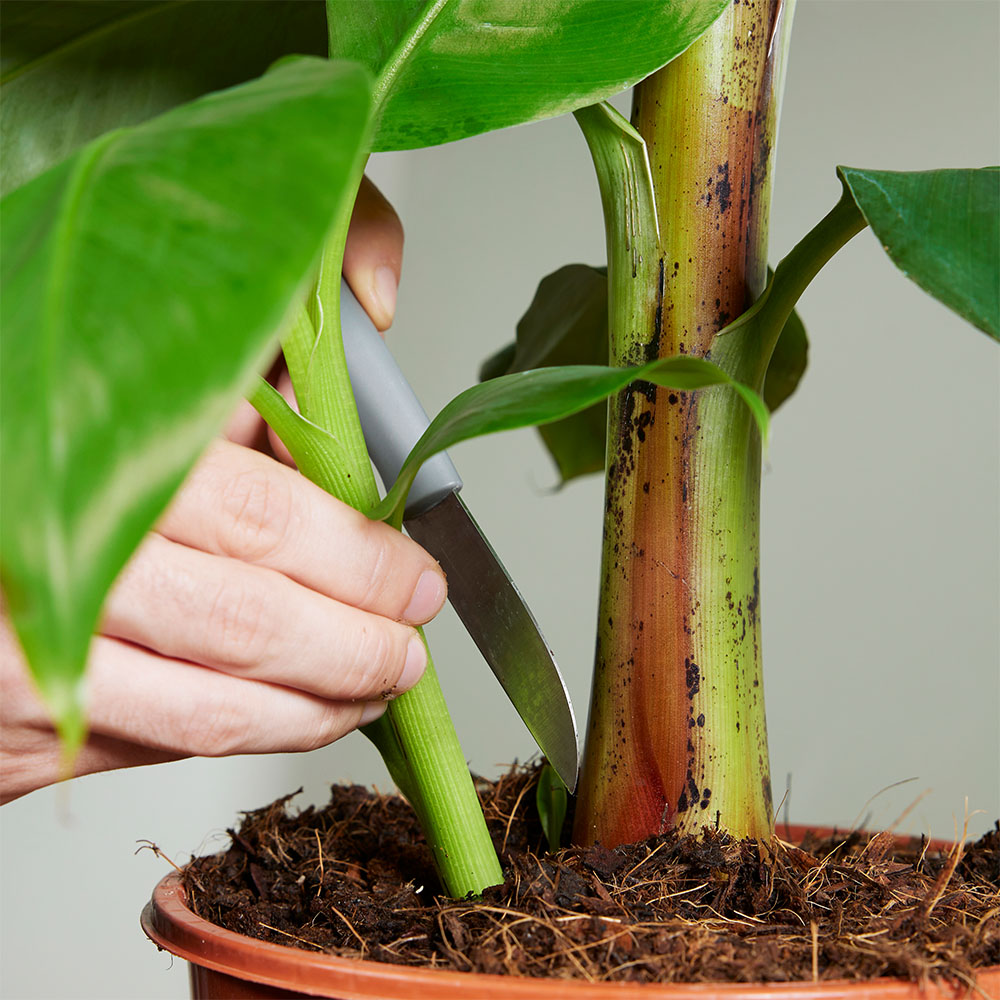 Schritt 1: Du solltest den Steckling am besten von der Mutterpflanze entfernen, wenn er mindestens 20 cm groß ist und etwa 2 oder 3 Blätter hat. Erst dann ist der Musa-Steckling stark genug.