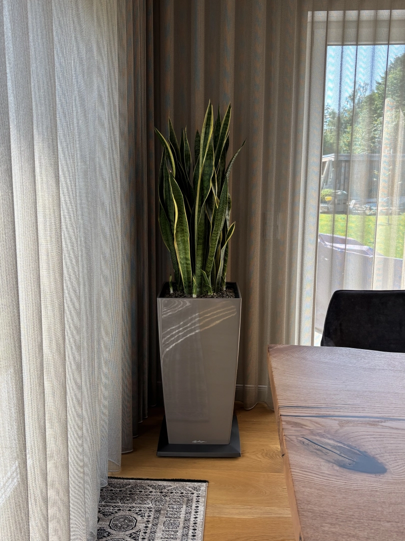 Sukkulenten wie diese Sansevieria verbrauchen wenig Wasser. Lassen Sie daher die Erde austrocknen, bevor Sie die Zimmerpflanze wieder gießen. Im Winter sogar mehrere Wochen. Je weiter die Frauenzunge vom Fenster entfernt steht, desto weniger Wasser verbraucht sie.